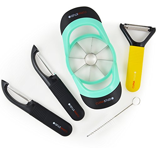 3-piece Peeler set (Straight, Serrated, Julienne) and one Apple Slicer Corer with Cleaning Brush included by Cuina Studio