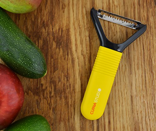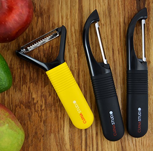 SET OF 3 PEELERS FOR FRUITS & VEGETABLES: Enjoy convenience like no other with our peeler set. Every set has one straight peeler, one serrated peeler and one julienne Y peeler. All peelers have a built-in potato eyer too.