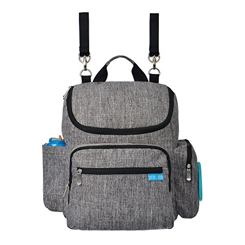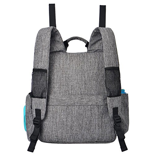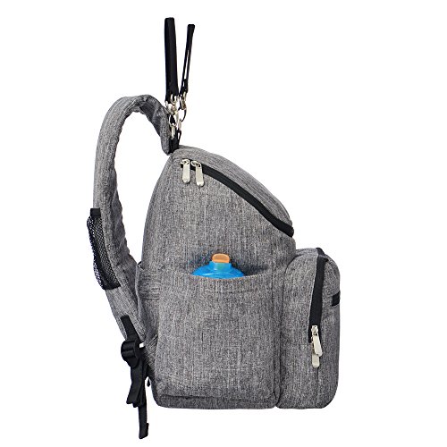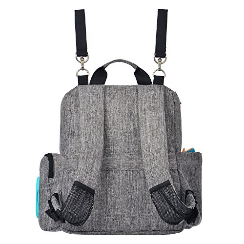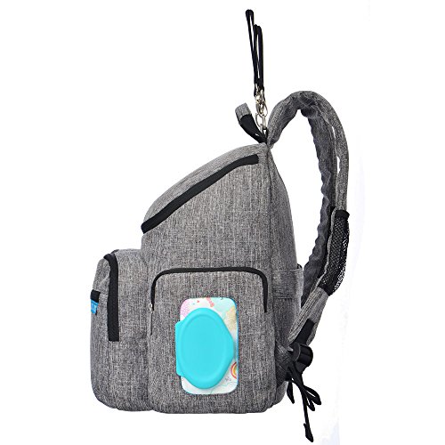 Features: Stroller clips with removable stroller straps; Adjustable, cushioned shoulder straps; Wipes pocket; Side bottle pocket; Wide dual zipper opening; Elasticized interior pockets; Zippered front pockets; Hidden zippered back pocket; Changing pad pocket which holds tablets and laptops up to 15".