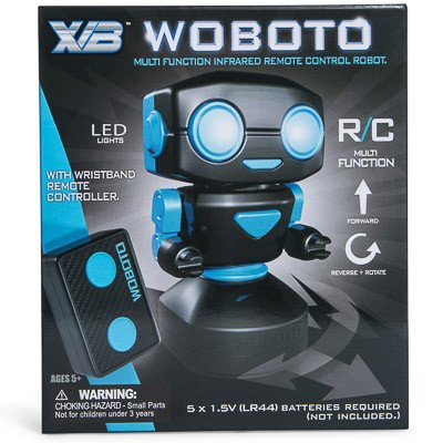 -. Binding : Toy -. Brand : XVB -. Color : Black -. EAN : 7110669242857 -. Feature : Mini Infrared controlled Robot Black Roboto Simple function with a fun personality. Race against each other with 2 different freq. 2 channels - forward and spin function Robotic fun toy Light up LED eyes Batteries Not included Wristwatch remote control band -. Label : CHINA -. Manufacturer : CHINA -. MPN : 1069 -. PartNumber : 1069 -. ProductGroup : Toy -. ProductTypeName : TOYS_AND_GAMES -. Publisher : CHINA -. Size : 4 1/4" HEIGHT, 2 3/4 WIDE -. Studio : CHINA -. Title : New Multi Function Remote Control Robot Black and Blue LED Lights Woboto USB powered robotics
