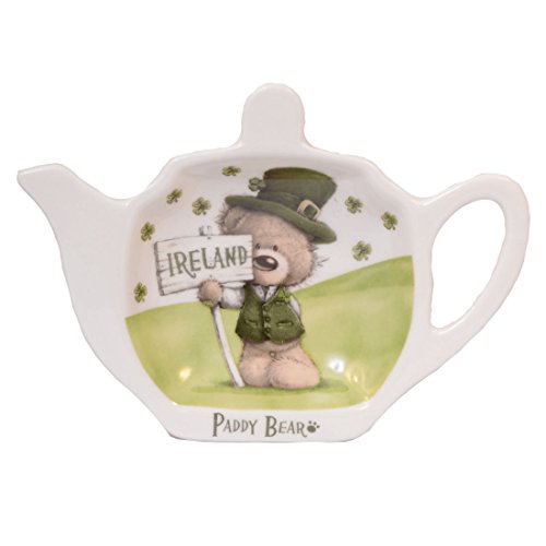 Product Description Meet Paddy, the first and original Irish bear. Cute and cuddly with a touch of mischief, he is Ireland's lovable bear. This tea bag holder is designed with Paddy holding a sign with 'Ireland' text along with raining Shamrocks. 0