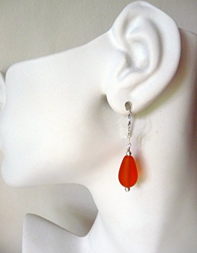 -. Title : Seaglass Teardrop Earrings, Tangerine Orange, Sterling Silver Earrings, Ocean, Beach Jewelry