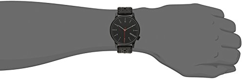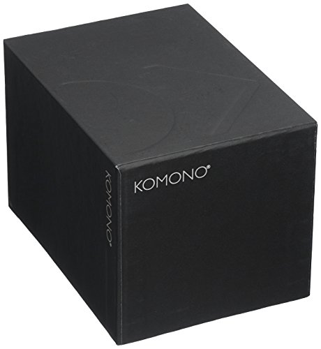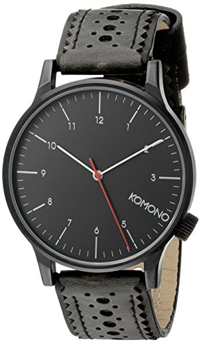 A KOMONO watch with a black-on-black-on-black bezel and dial. Stainless steel case and brogue-style leather strap. Contrast marks and branding at the 4. Japanese quartz movement and off-center, single-crown design.Feature
