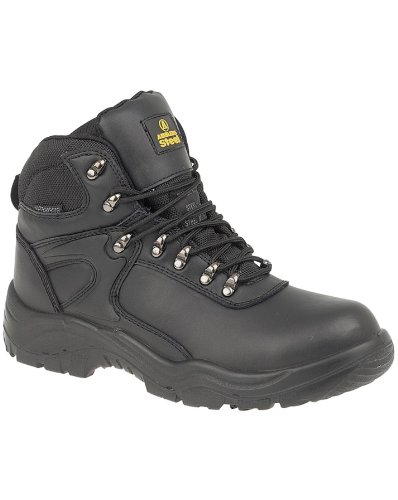 -. Feature : Waterproof black safety boot with steel toe cap and midsole protection. / Water resistant leather upper and fully waterproof breathable mesh lining. / Reduces foot fatigue with its shock absorbing heel of up to 20 joules. / Secure fitment offered by seven hard-wearing metal D-Ring lace holes. / Padded bellows tongue prevents debris entering boot.