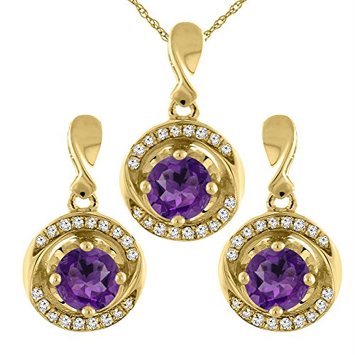 -. Title : 14K Yellow Gold Natural Amethyst Earrings and Pendant Set with Diamond Accents Round 4 mm