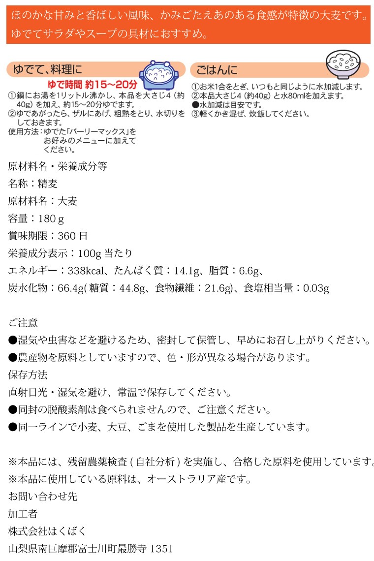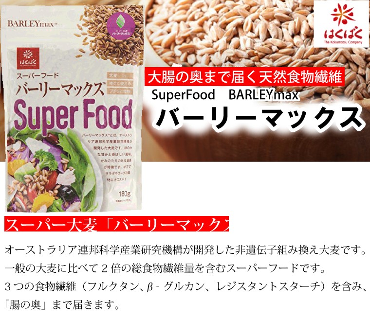 オーストラリア連邦科学産業研究機構が開発した非遺伝子組み換え大麦です。一般の大麦に比べて2倍の総食物繊維量を含むスーパーフードです。3つの食物繊維(フルクタン、β‐グルカン、レジスタントスターチ)を含み、「腸の奥」まで届きます。ほのかな甘みと香ばしい風味、かみごたえあのある食感が特徴の大麦です。ゆでてサラダやスープの具材におすすめ。