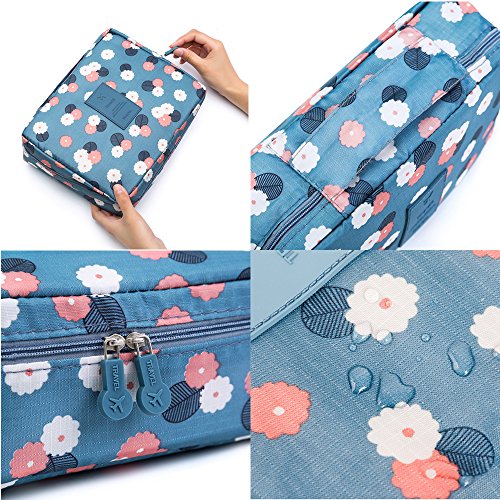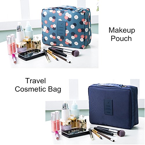 2 pack Printed Multifunction Portable Travel Toiletry Bag Cosmetic Makeup Pouch, Waterproof Makeup Organizer Case (Blue flower and Navy Blue)