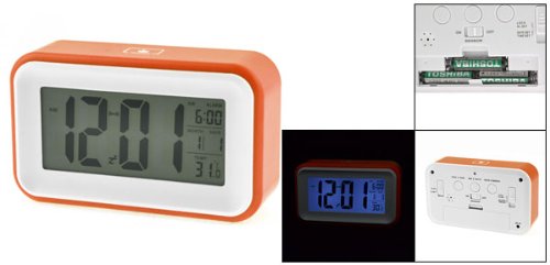 - Feature : Product Name : Calendar Alarm Clock;Function : Light Sensor Control, Alarm, / Display : Month, Date, Hour, Minute, Week, Calendar, Temperature;Material : Plastic / Operated By : 3 x 1.5v AAA Battery( Battery is not included);Color : White,Orange / Size : 15 x 9 x 5cm / 5.9" x 3.5" x 2"(L*W*T);Net Weight : 215g / Package Content : 1 x Calendar Alarm Clock