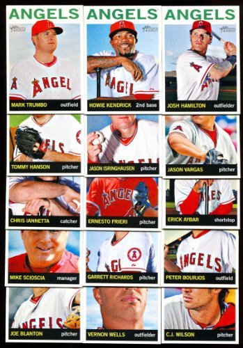 This is a 2013 Los Angeles Angels of Anaheim Topps Heritage Baseball complete mint 15 basic card team set; it was never issued in factory form. Cards included are Josh Hamilton #246, C. J. Wilson #32, Peter Bourjos #48, Erick Aybar #97, Mark Trumbo #110, Howie Kendrick #205, Jason Vargas #228, Vernon Wells #264, Garrett Richards #299, Ernesto Frieri #301, Jason Isringhausen #319, Joe Blanton #372, Mike Scioscia #383, Chris Iannetta #414 and Tommy Hanson #415.