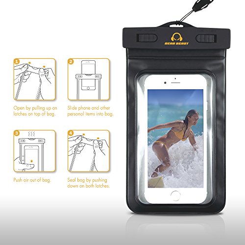 - Feature : UNIVERSAL WATERPROOF CASE BAG and ARMBAND fits all smartphones up to 6.5 inches tall and 3.5 inches wide. Keep your phone, along with your ID, credit cards, wallet, money or other personal items dry and clean in this waterproof dry bag. Perfect for running, cycling, hiking, kayaking, skiing, fishing or just going to the pool, to the beach or anywhere else where you want to keep your phone from getting damaged by water or other elements. / CRYSTAL CLEAR WATERPROOF TPU material provides full touch screen access and allows you to take pictures and videos without removing your phone from the waterproof case. Dual latch design EASY TO OPEN AND CLOSE when you need to remove your items or seal them back up in a hurry. / IPX8 CERTFIED WATERPROOF to 10 feet; Secure seal provides protection from water, dirt, sand, snow, grease and other elements that could damage your phone. Compatible with protective cases like Otterbox. Lifeproof, SUPCASE and Urban Armor on most phones (phones with displays larger than 5.3 inches may need to remove protective case to fit). / MULTI-POSITION ARMBAND STRAP fits arms with circumference of 10 to 16 inches. Gear Beast Armband Extender Strap available on Amazon for arms 16 to 20 inches. BUILT-IN HEADPHONE EXTENDER allows you to connect your headphones without opening the case and potentially exposing the contents to water or other elements. / Compatible with the latest devices including iPhone SE, 6s, iPhone 6s plus, iPhone 6, 6 Plus, 5, 4, Galaxy Note 5, 4, 3, 2, edge, S7, S7 edge, S6, S6 edge, S6 edge plus, HTC One M8, M9, Motorola Moto G, Moto E, Moto X, Droid Maxx, Droid Turbo, Moto X Pure, Droid Maxx 2, Droid Turbo 2, HTC Desire, Nokia Lumia. Windows Phone, Moto X, Nexus 5, Sony Xperia Z3, Z2, Z1, Honor 6, OnePlus 2, LG G3, G4, and many other phones and electronic devices.