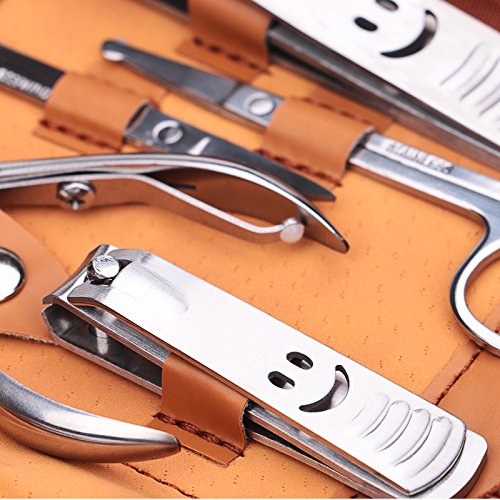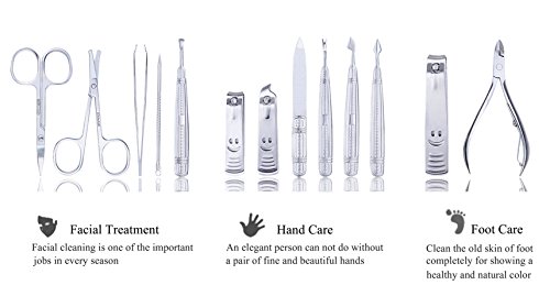 Contents: 12 Pcs of manicure tools, including: 3 Nail clippers / trimmers of different sizes 1 Nose hair scissors 1 Eyebrow scissors 1 Eyebrow tweezer 1 Ear pick 1 Cuticle trimmer 1 Blackhead remover 1 Nail file 1 V-shaped tool 2 Nail cleaning tools