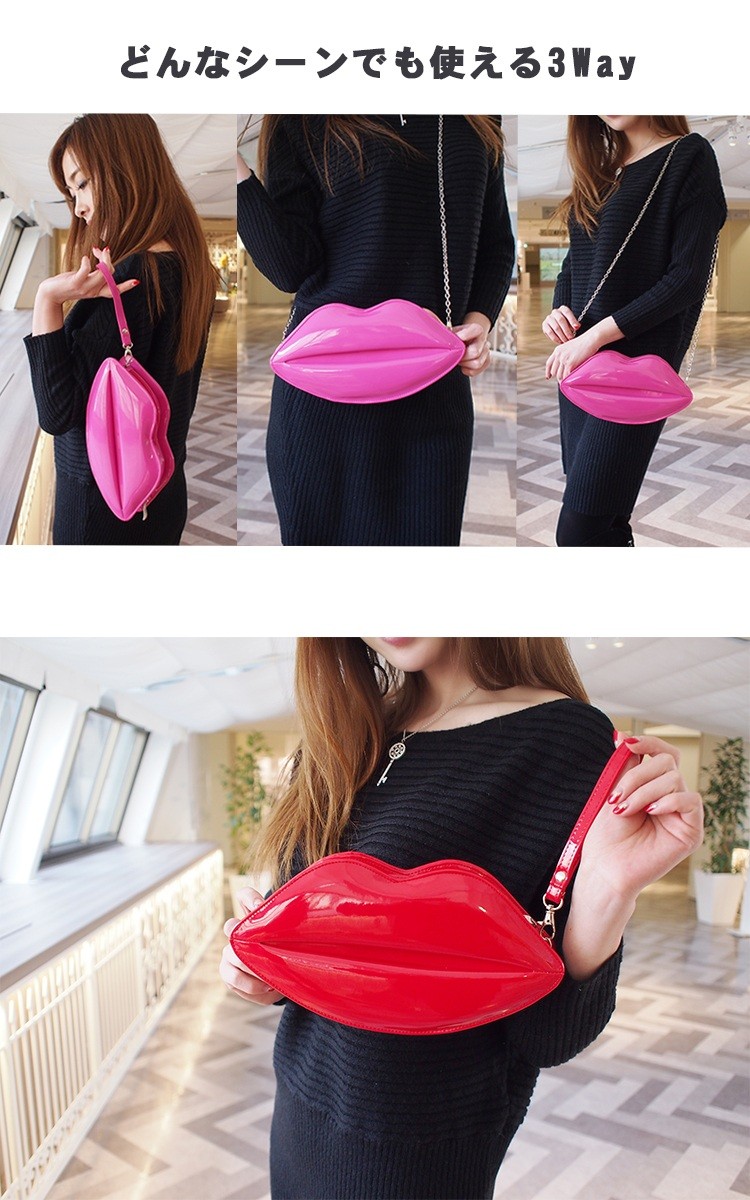 大人気どこにもないデザインが可愛い 3WAY唇バッグ、クラッチバッグ 女子会バッグ 唇バッグ 斜めがけバッグ リップバッグ