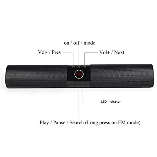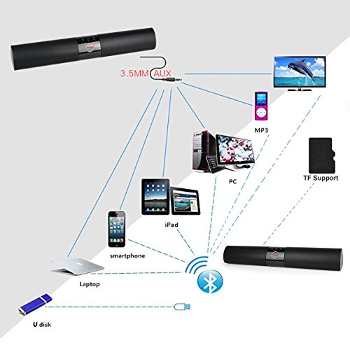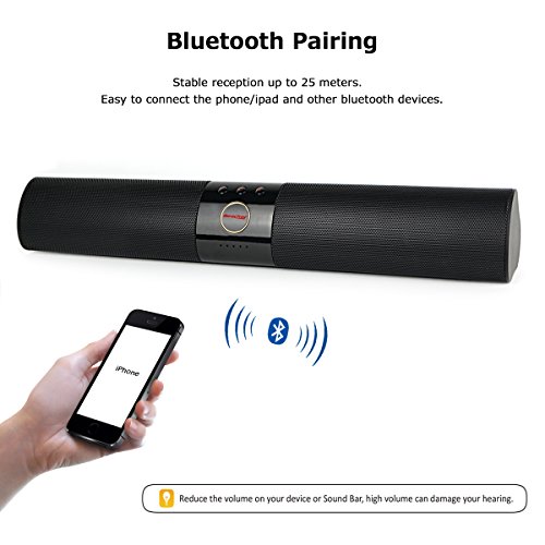 Built in 2200 mah rechargeable battery, you can play music for up to 4~8 hours based on volume. Recharge in just 3-4 hours with included micro USB cable! Soundbar will automatically turn off for saving power when your bluetooth device disconnect over 5 minutes.