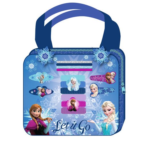 Disney Frozen pvc bag with hair accessories. Includes 4 elastics, 2 pvc snap clips, 6 terry ponies and 2 barrettes. Suitable for all children ages 3 and up. Comes packaged in a Frozen printed box featuring Princess Anna, Princess Elsa and many more of your favorite Frozen characters.Feature