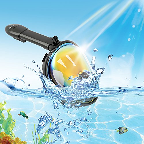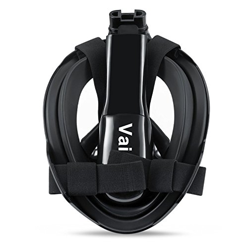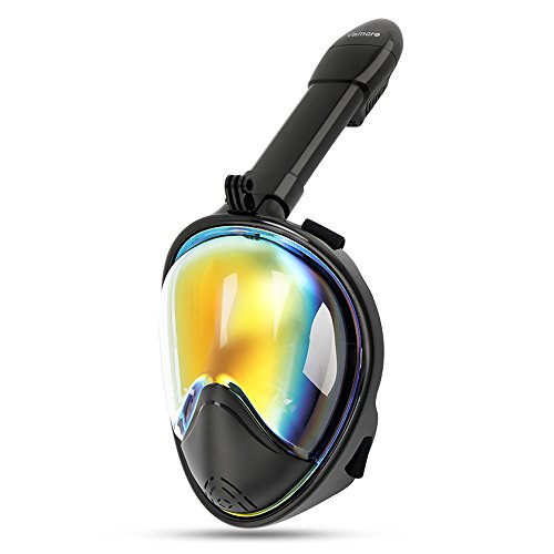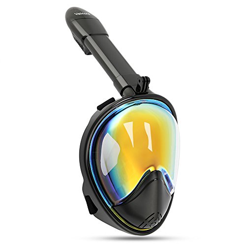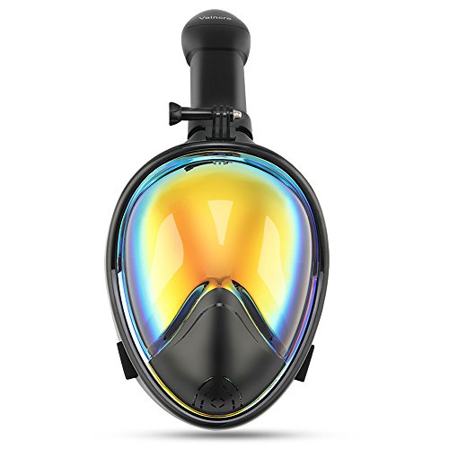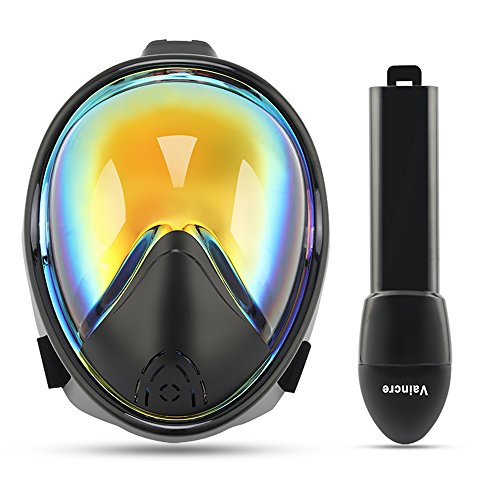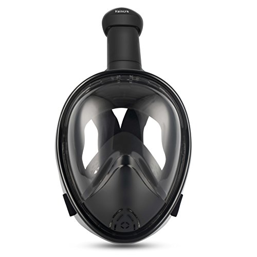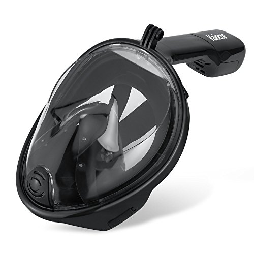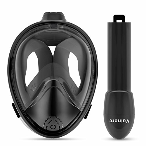 Vaincre 180° Full Face Snorkel Mask with Panoramic View Anti-Fog, Anti-Leak with Adjustable Head Straps with longer Snorkeling Tube Larger Area Flat Black with movable mount L/XL