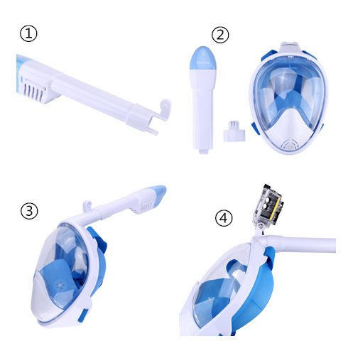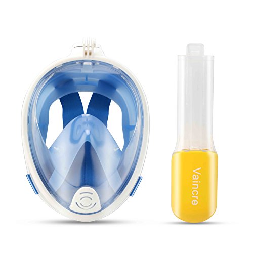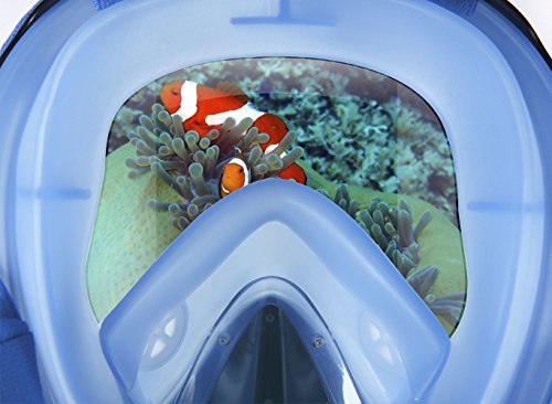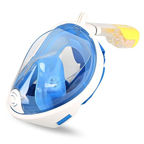 Vaincre 180° Full Face Snorkel Mask with Panoramic View Anti-Fog, Anti-Leak with Adjustable Head Straps with longer Snorkeling Tube Larger Area Flat Blue with movable mount L/XL