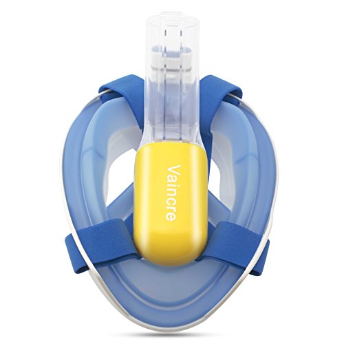 Vaincre 180° Full Face Snorkel Mask with Panoramic View Anti-Fog, Anti-Leak with Adjustable Head Straps with longer Snorkeling Tube Larger Area Flat Blue with movable mount S/M