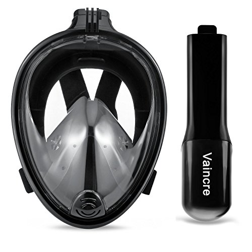 Vaincre 180° Full Face Snorkel Mask with Panoramic View Anti-Fog, Anti-Leak with Adjustable Head Straps with longer Snorkeling Tube Larger Area Flat Black with integrated mount L/XL
