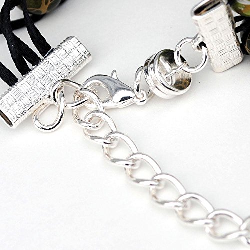 - Materials include: silver-plated brass findings and chain, ribbon, and resin and/or wood beads.