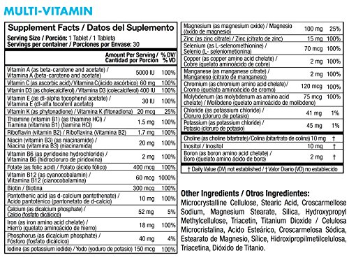 KEY NUTRIENTS: Our Multi-Vitamin contains 29 key nutrients for your body: Vitamin A (as beta carotene and acetate), Vitamin C, Vitamin D3, Vitamin E, Vitamin K, Vitamin B1, Vitamin B2, Vitamin B3, Vitamin B6, Folate, Vitamin B12, Biotin, Pantothenic Acid, Calcium, Iron, Iodine, Magnesium, zinc, selenium, copper, manganese, chromium, molybdenum, chloride, potassium, boron, choline, inositol powder.