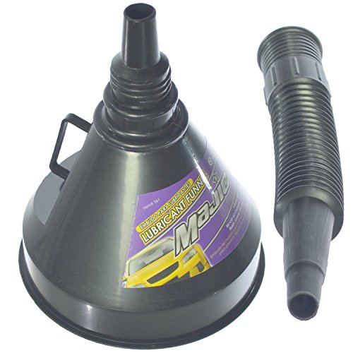 The Majic Lubricant Funnel with Flexible Extension is used for engine oil, coolant, gasoline, kerosene and other fluids. It is constructed of a chemical-resistant polyethylene with a removable flex extension to adjust the flow of liquid, if desired.