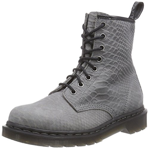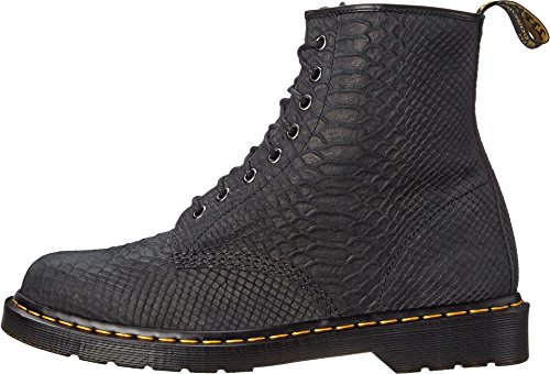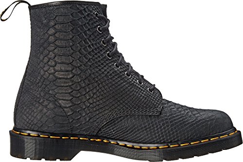 Durable leather upper with python print. Eight metal eyelet lace-up closure provides a secure and snug fit. Classic back pull loop for easy entry. Goodyear® welted construction provides durability with an upper and sole that are heat-sealed and sewn together. Leather and textile lining for a comfortable next-to-skin feel. Lightly cushioned leather footbed for added comfort. Dr. Martens' original air-cushioned outsole is slip, oil, and abrasion resistant. Imported.
