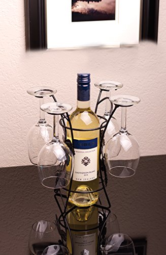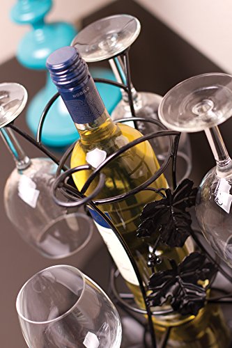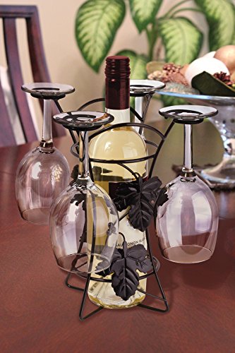 • Decorative metal wire frame with leaf embellishments. Place your favorite bottle of wine inside, hang up to 4 long stem wine glasses on the holders.