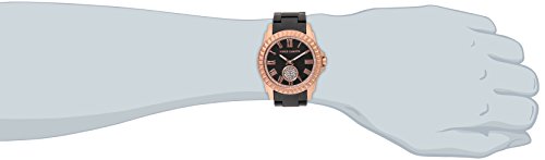 Matte rose gold-tone pyramid bezel; matte black dial; outside ring accented with 80 clear Swarovski crystals; remote second hand set with 36 clear Swarovski crystals
