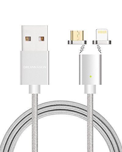 -. Feature : Product Concept: Dreamvasion magnetic cable has 1 Lightning connector and 1 Micro USB connector, allows you to charge Apple device or Android device, compatible with iPhone 7 / 7 plus / 6 / 6s / 6 plus / 6s plus / 5 / 5s / 5c / SE, iPad Pro, iPad Air, iPad Mini, Galaxy, LG, HTC and more. LED lights indicate the charge and sync. / Magnetic Absorption: Stronger Magnetic Force compared to other similar cables to keep magnet held in place, your phone is not easy to fall out, reversible magnetic interface suction, easy to connect with the plated interface without recognize up side and down side. / Fast Charging and Syncing: Charging and data transmission at the same time both in extreme high speed. Deliver up to 2.4A, transmission speed can increase 20%, your phone could be fully charged for only 1.5 hours. This charging cable can backup files or transfer pictures, music and videos all while charging your device. / Aluminum Alloy Shell: Aluminum alloy material is not only showing the high-grade appearance, but also has a wear resistant and scratch resistant. Effectively play its shielding effectiveness,Enhance the ability to resist interference, to ensure high-speed signal transmission. / Nylon Braided Cable: 3.3 feet length, using nylon environmental material protection wrapped copper wire core, to ensure a more durable charger with a longer lifespan GUARANTEED. Resistance to pull, more durable, Pull Tested over 30,000 times to prove a greater longevity.