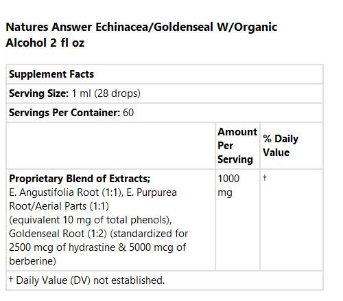 -. Binding : Health and Beauty -. Brand : Nature's Answer -. EAN : 0083000002670 -. Feature : AF Bitters with ginger / AF Black Walnut & Wormwood Complex / AF Bladdex -. IsAdultProduct : 0 -. IsAutographed : 0 -. IsMemorabilia : 0 -. Label : Nature's Answer -. LegalDisclaimer : * These statements have not been evaluated by the Food and Drug Administration. This product is not intended to diagnose, treat, cure or prevent any disease. ** Always refer to the manufacturer's label on the product for description, recommended dose and precautions. -. Manufacturer : Nature's Answer -. Model : CB37A -. MPN : NA0292 -. NumberOfItems : 1 -. PackageQuantity : 1 -. PartNumber : NA0292 -. ProductGroup : Health and Beauty -. ProductTypeName : HEALTH_PERSONAL_CARE -. PublicationDate : 2010-11-24 -. Publisher : Nature's Answer -. Size : 2 oz -. Studio : Nature's Answer -. Title : Nature's Answer Echinacea & Goldenseal with Organic Alcohol, 2-Fluid Ounces -. UPC : 083000002670