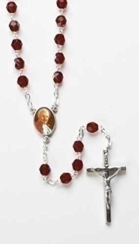 Rosary have deep red beads and a medallion featuring the image of St. Pope John XXIIISilver metal crucifix