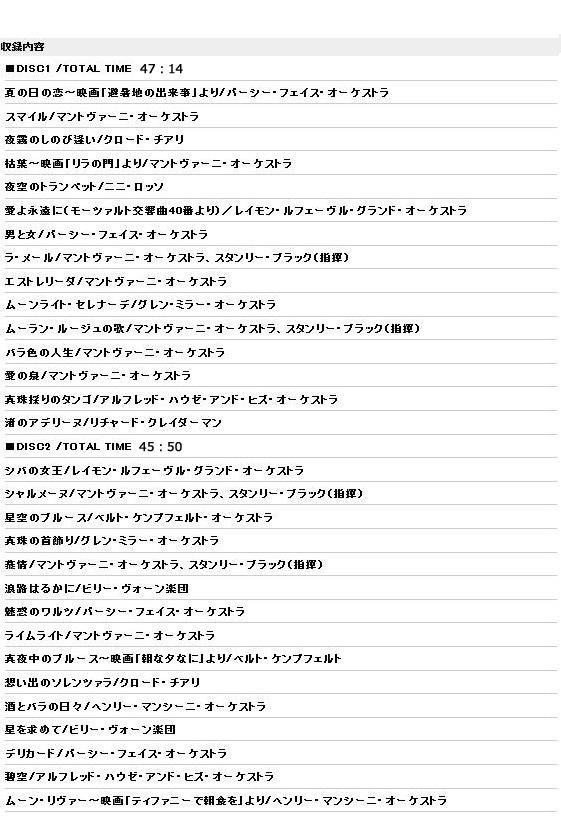 「シバの女王」、「夜霧のしのび逢い」、「真珠の首飾り」などの名曲を収録したCD2枚組。