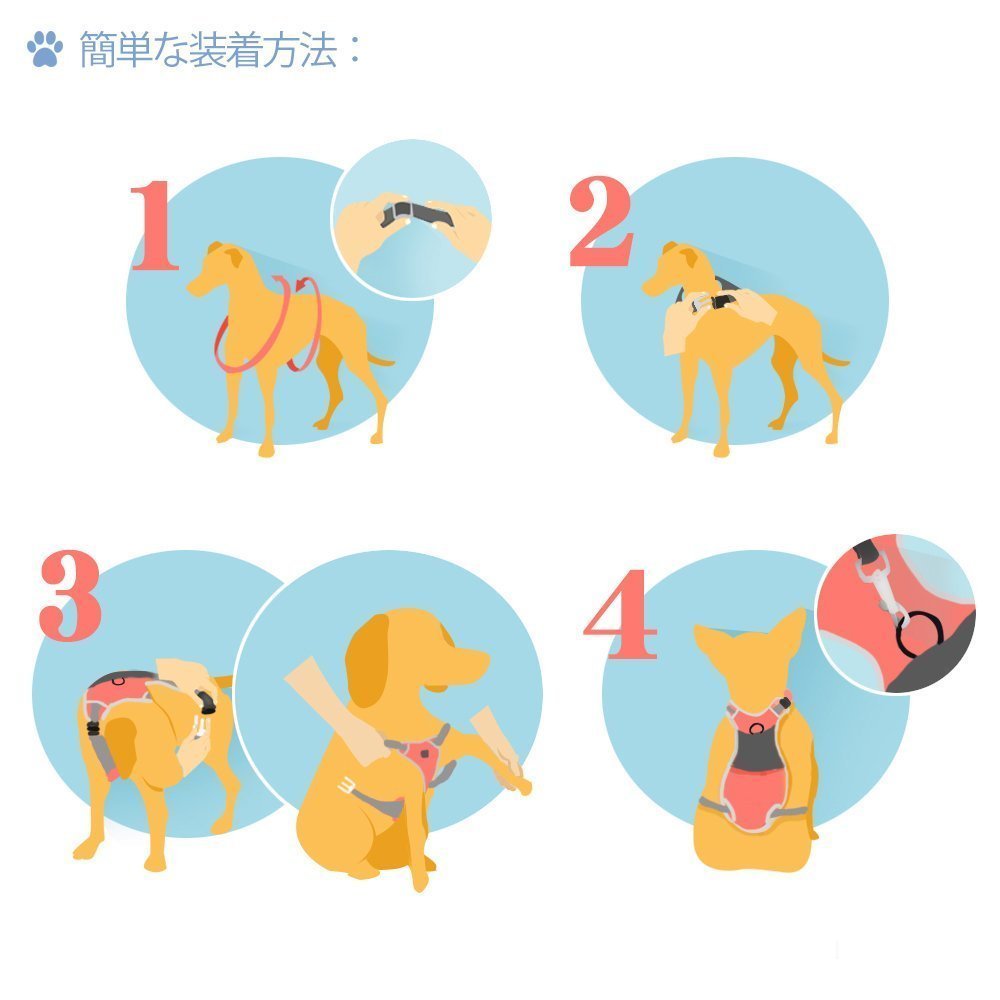 【4箇所サイズ調節可能】より完璧なサイズを調整できることで、ひっぱり防止効果が格段にアップ!調節幅は大きいので、犬が自然に太っても十分に対応できる。
