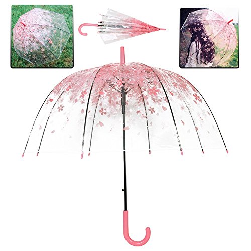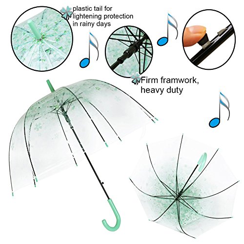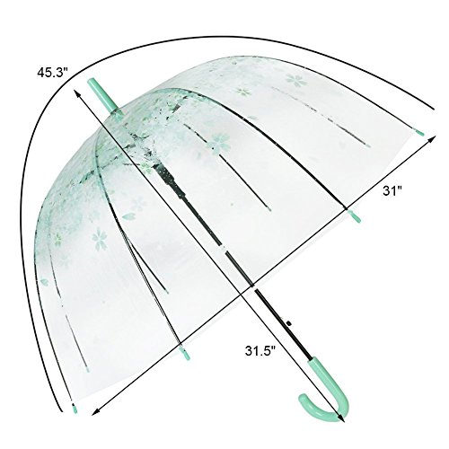-. Feature : ☂The Arc of The Umbrella Surface:115cm/45.31in, Open Diameter 78cm/30.73in, Length 80cm/31.52in,capable of withstanding wind and rain,you are able to atay ary when it is raining and still see in front of me when you are walking while being fashionable,keeps you drier than the traditional umbrellas. / ☂Design of Anti - Stab in Arc:Made from sturdy steel and High quality transparent plastic umbrella cloth, the umbrella is highly durable,Romantic cherry print umbrella cover clear rain umbrella and elegant green hook handle. / ☂Auto Open:automatic opening: Easy automatic opening function means that the screen top opens when a button is pressed,it is perfect to protect you from bad rainy days. / ☂Classic Dome Shape Umbrella :Fresh and lovely, can be used as a gift to your girlfriend or child. Lightning protection umbrella tail, the product is safe to use in rainy days, Durable Umbrella Fabric, give bright line of sight. / ☂High Quality :Great coverage from strong winds and heavy rainfall, dome bubble umbrella helps you keeping more dry than traditional umbrellas.
