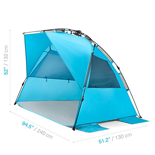 -. Feature : Specially designed EasyUp Hub System showcases industry leading design. The fastest and easiest set up and take down of all beach tents on the market / The Deluxe XL version is lightweight and compact, weighing just over 6 pounds and folding down to a travel size of 38 L x 6 W x 6 H. The beach tent provides protection from the sun, rain and wind for all outdoor activities, UPF 50+ sun protection and 3 X-large windows for ventilation. The beach tent is made from breathable polyester and is water repellent / The tent is 95 L x 52 H x 51 D, providing a spacious interior shelter that comfortably fits 3-4 people. The beach tent has internal pockets to store personal items and hooks for hanging. It is made of a durable and lightweight fiberglass frame and water resistant PE floor makes the EasyUp Beach Tent a great outdoor accessory / Includes a carrying case, 5 sand pockets for added stability in windy conditions, and stakes / Pacific Breeze's consumer friendly 1-year limited warranty. Call or email any time for support