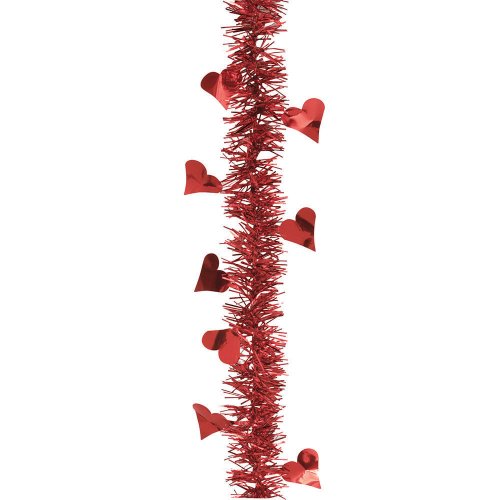 - Hearts Tinsel Garland features red tinsel with red foil hearts sprinkled throughout