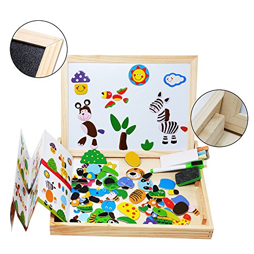 Product Benefits: ? Magnetic shapes and chalk allow you to create or drawing fantastic animals world depending on their imagination.also can be used for parent-child games. ? Definitely a toy that will last forever and kids won't get bored of it, they will find different ways to use it. ? It came with a nice illustrations book so you can make endless numbers of drawings outta it.!!! ? This is a nice quiet bag toy which is a bag keep with toys inside for trips where might be waiting either traveling or while at a game, Dr's office, or meeting. ? It has a lot of animals, house, flowers, trees, cloud shapes. They are well made and stay on the board pretty good. ? Works with both upper extremities / hands / fingers as well as the brain. A great educational wooden toy set for all kindergarten and above.