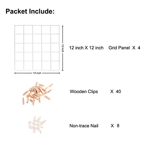 - Package Included:4 Pcs 12×12 inch metal mesh wire grid panel,30 Pcs "clothespins",8 Pcs Non-trace nails.100% satisfaction gurantee, in case any problem or you are not satisfied, full refund or replacement for free guranteed