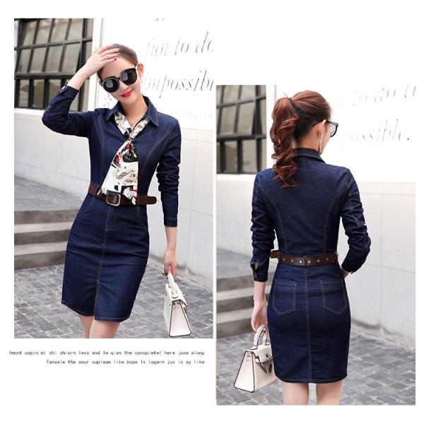 前スリットデニムシャツタイトワンピース レディース チュニック 長袖 膝丈 無地 2017 新作カジュアルな雰囲気のデニムワンピース*