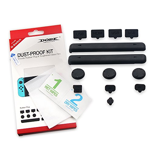 -. Feature : Specially Designed : Rubber Plug & Tempered Glass Screen Protector for Nintendo switch / Convenience : Protect your Switch Console roundly, Prevent from dust and scratch / Materials: Silicone Rubber Glug + High-end glass / 1 PCS glass screen protector + 1 PCS dust proof kit + 1 PCS Wet wipes + 1 PCS dry wipes