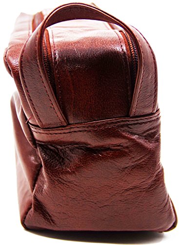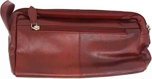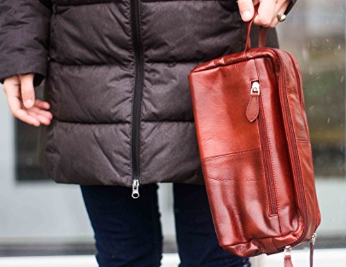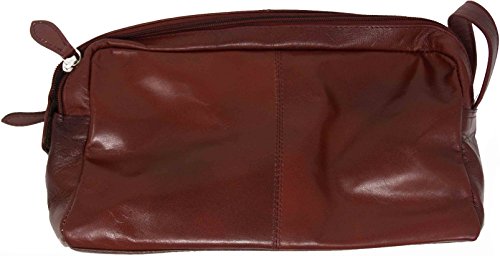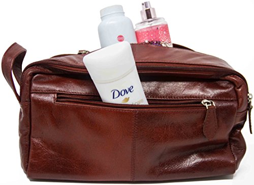 - Made from 100% genuine cowhide leather that is water and stain resistant, these stylish leather toiletry bags are available in black and deep brown colors. They feature a double zipper compartment to better help you organize your travel essentials. A third compartment on the outside can be used for storing smaller products.