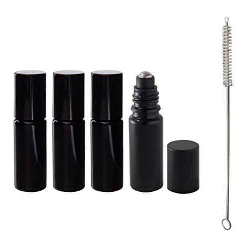 Includes four 10 ml / 0.34 oz Black Ultraviolet Glass Roll On Bottles with Steel Roller Ball, a Funnel for easy refilling and a Bottle Brush Cleaner