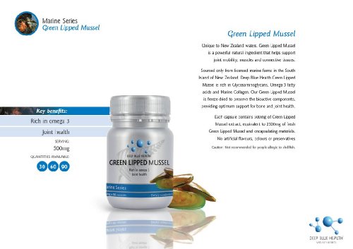 -. Binding : Health and Beauty -. Brand : iTopGolf - Green Lipped Mussel - 90 Capsules -. EAN : 9421026537669 -. Feature : The Miralcle from New Zealand for Arthritis Care and Joint Health / Clinically proven to reduce joint pain in humans and animals / From the pure water of clean green New Zealand / "Cold" opened Mussels - not like the cheap "steamed" opened products / Sourced from licensed marine farms in the South Island of New Zealand -. IsAdultProduct : 0 -. Label : Deep Blue HealthTM -. LegalDisclaimer : Not recommended for people allergic to shellfish. Not recommended during pregnancy or lactation. -. Manufacturer : Deep Blue HealthTM -. Model : DBHMGL90 -. MPN : GLM01 -. PackageQuantity : 1 -. PartNumber : GLM01 -. ProductGroup : Health and Beauty -. ProductTypeName : HEALTH_PERSONAL_CARE -. Publisher : Deep Blue HealthTM -. Studio : Deep Blue HealthTM -. Title : Green Lipped Mussel - 90 Capsules - The Miracle From New Zealand for Arthritis Care and Joint Health -. UPC : 884120222371