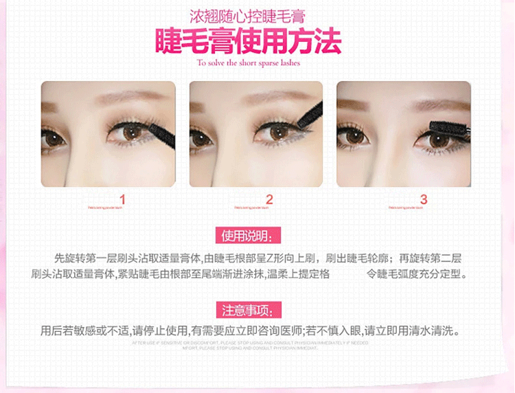 1、先旋转出最上面第 1 层的粉色部分。刷头膏体量较少,由睫毛跟部呈Z字形向上45度刷出优美轮廓和纤长效果;