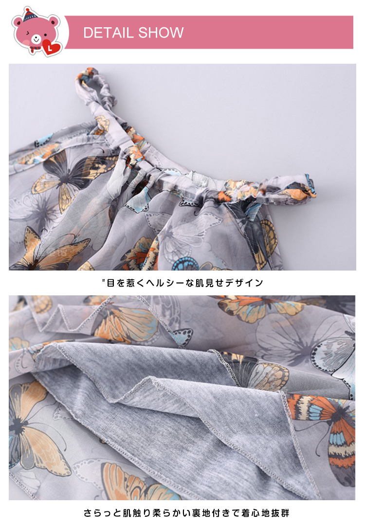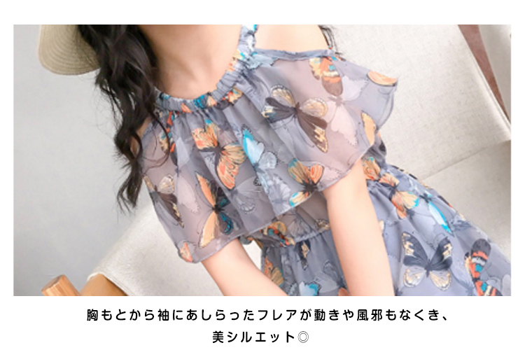 | 大人っぽい片開きデザインがスタイリッシュアップ全体に散らばった蝶々柄がとっても可愛い、このまま飛んでいこう??ストンと落ちるシルエットが上品さを漂うエアリーな1枚◎ウェストゴムでキュッと締めつけられ、メリハリのある可愛いシルエットをメイクデイリー使いはもちろん、麦わら帽子などをコーデに取り入れると、リゾート雰囲気に♪ | |