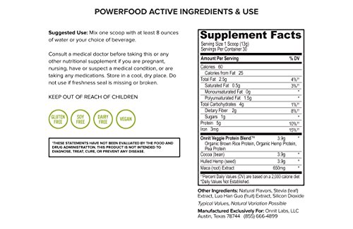 Powerfood Active is a next generation plant based protein supplement loaded with earth grown nutrients designed to optimize an active lifestyle. The decadent chocolate flavor comes from pure cocoa and is enhanced by one of the most sought-after performance foods in the world: maca. Yielding 16 grams of plant protein from organic hemp, organic brown rice, and peas, Powerfood Active contains a balanced amino acid profile and both essential fatty acids (Omega-3 and Omega-6) and Omega-9. Delicately sweetened with stevia and monk fruit, this low glycemic, high fiber blend makes insanely delicious smoothies and moreFeature