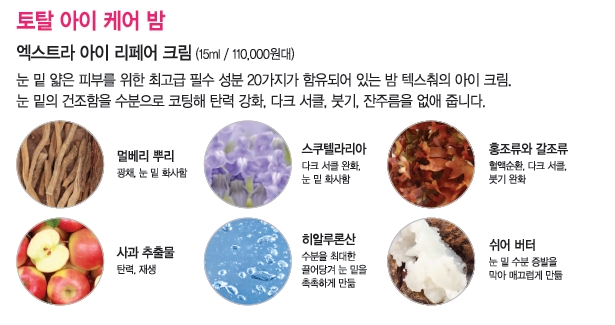 눈가 보습과 탄력 개선 등의 기능으로 민감한 눈가를 섬세하게 관리해 주는 토탈 아이 솔루션 크림과 55,000원 상당의 3종 사은품이 포함된 세트 제품입니다.