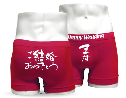 結婚祝いのプレゼントにメッセージの入ったボクサーパンツはいかが?ヒップにはご結婚おめでとう、フロントには寿&Happy Weddingの文字が入っています。大切な人、お友達、の結婚のお祝いに贈ってみませんか?ユニセックス仕様なので男女共に着用できます。お揃いで、新婚さんにプレゼントしてみましょう!!