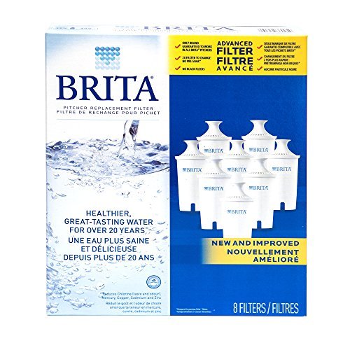 -. Feature : New and improved 8 pack of replacement water filters that fit all Brita pitchers and dispensers. Packaging may vary. / 8 water filter can replace 800 standard 16.9 ounce water bottles / Reduces chlorine taste and odor, zinc, copper, mercury and cadmium, often found in tap water / Replacement filter changes quickly and easily and leaves no black flecks in water