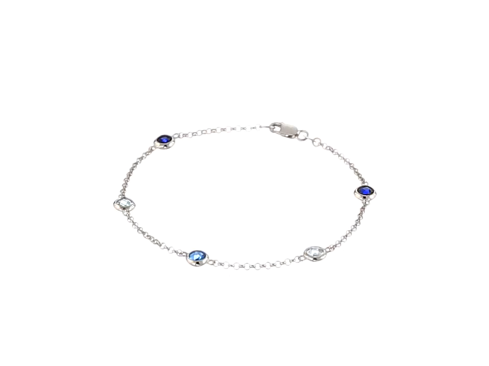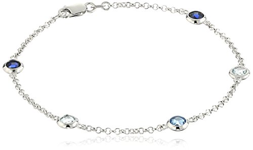 Rhodium Plated Sterling Silver Sky Blue Topaz, Lab-Created Aquamarine and Created Blue Sapphire Bezel Set Bracelet, 7.25"